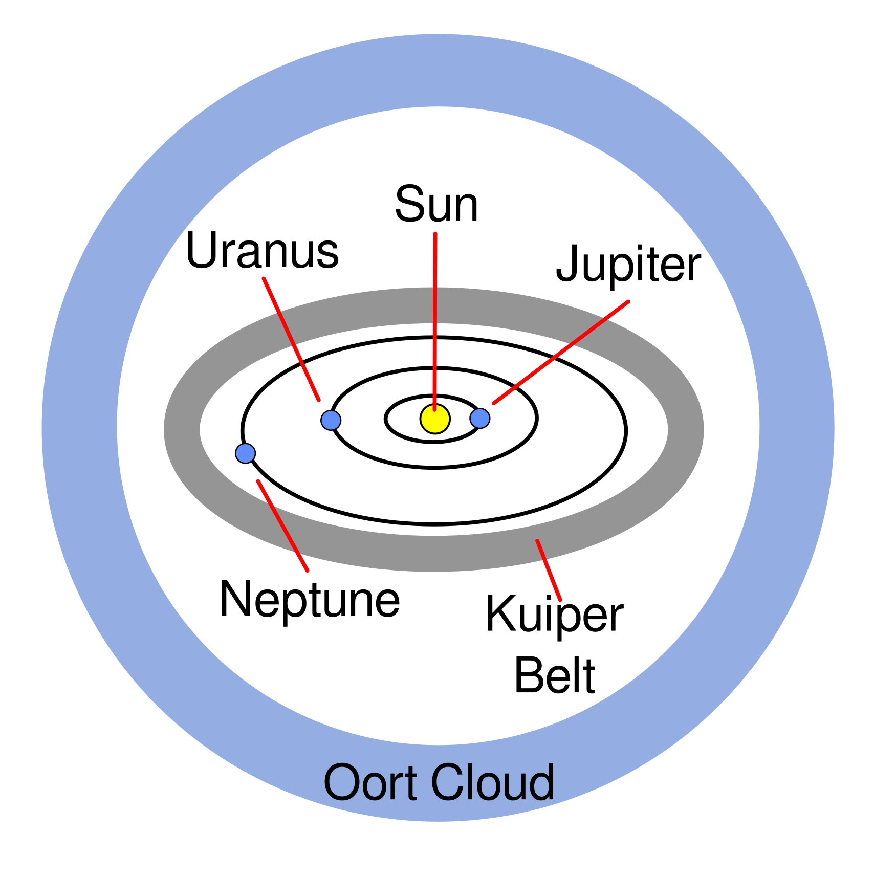 Jupiter is about five times further from the Sun than the Earth, while Neptune is about thirty. Beyond Neptune is the Kuiper Belt at about 30-50 astronomical units (AU, the Earth-Sun distance). Beyond the Kuiper Belt is the Oort Cloud that extends to the limits of the Solar System, about two light years.