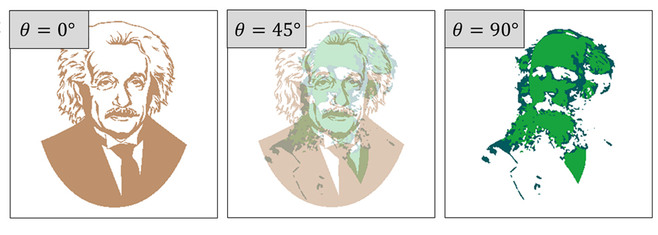 Overlapped images, portraits of Albert Einstein and Ludwig Boltzmann, are selected by different polarizations. The Boltzmann image is not as distinct, but it illustrates the principle. (Portion of Fig. 5 of ref. 1.[1] POSTECH illustration licensed under the Creative Commons Attribution 4.0 International License. Click for larger image.)