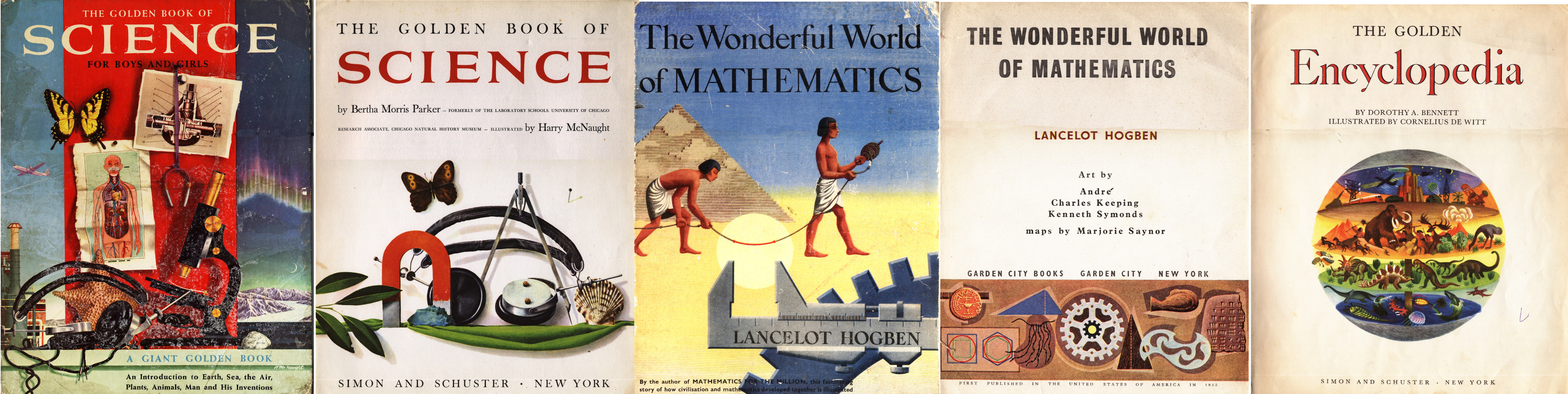 Some children's books about science and math from the mid-20th century. From left to right, cover and frontpiece of the The Golden Book of Science (1956), cover and frontpiece of The Wonderful World of Mathematics (1955), and frontpiece of The Golden Encyclopedia (1946). (Scans of my copies. Click for larger image.)