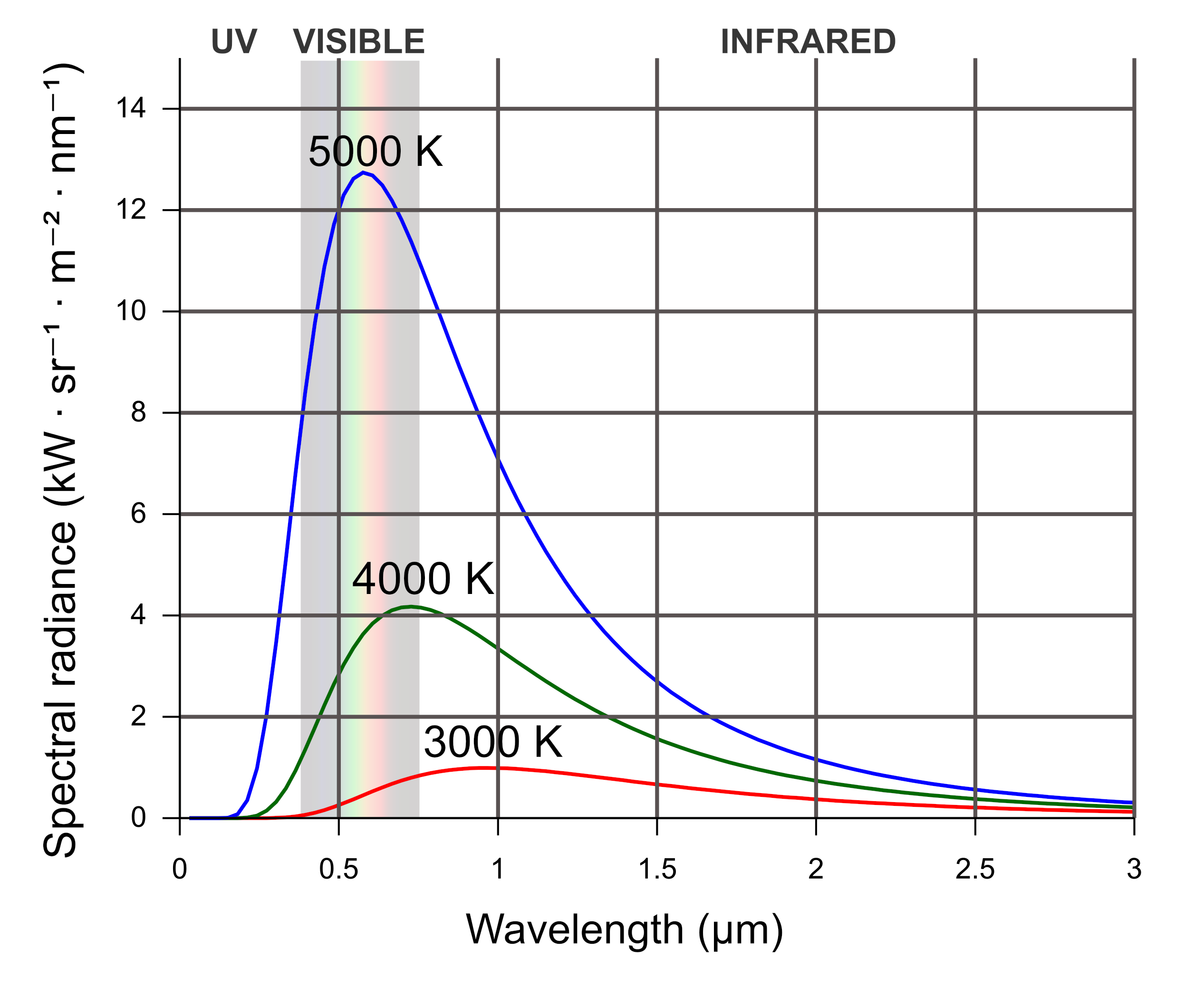 Higher temperatures are characterized by greater energy and a shift to lower wavelengths.