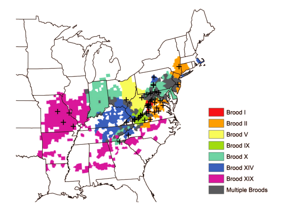 geographic distribution of periodical cicada broods.