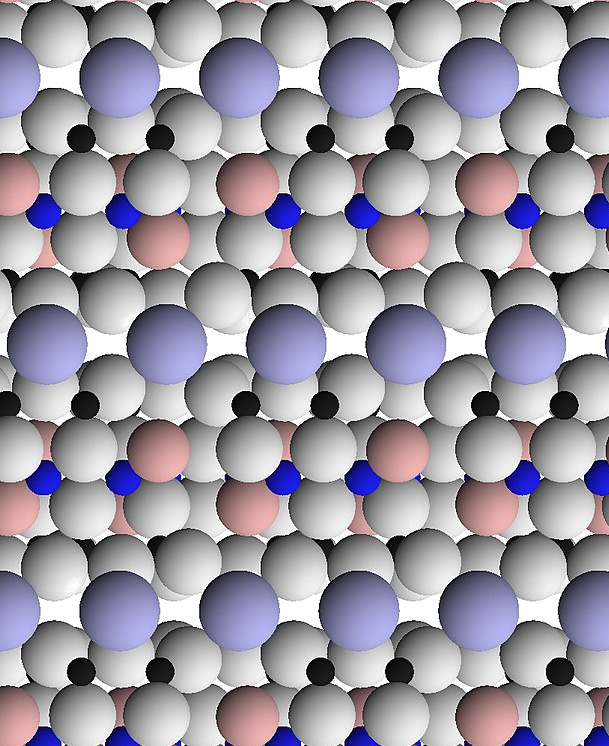This atomic representation of Muscovite mica shows a view parallel to its layers. Two full layers are seen at the image center.