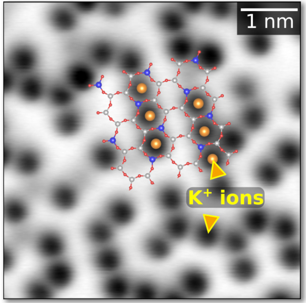 The study shows that the K+ cations on the surface, imaged as black, are arranged with short-range order.