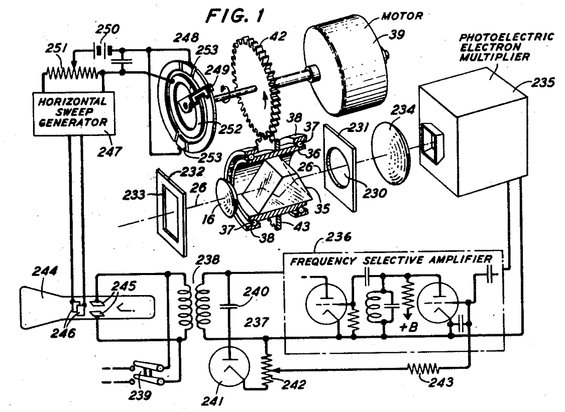 Figure 1 from US Patent no. 2,884,540, "Radiant energy control system," by William Shockley, April 28, 1959. As one whose history parallels that of transistor technology, it's interesting to see illustrations of the various mechanical and vacuum tube elements that were needed to accomplish things 70 years ago. (Via Google Patents.[11] Click for larger image.)