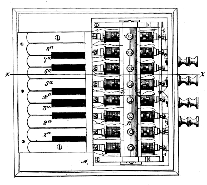 The tone aspect of this patent, which was issued subsequent to his 1875 patent, US Patent No. 166.095, "Electric Telegraph for Transmitting Musical Tones,"[8] can be seen from the representation of a musical keyboard.