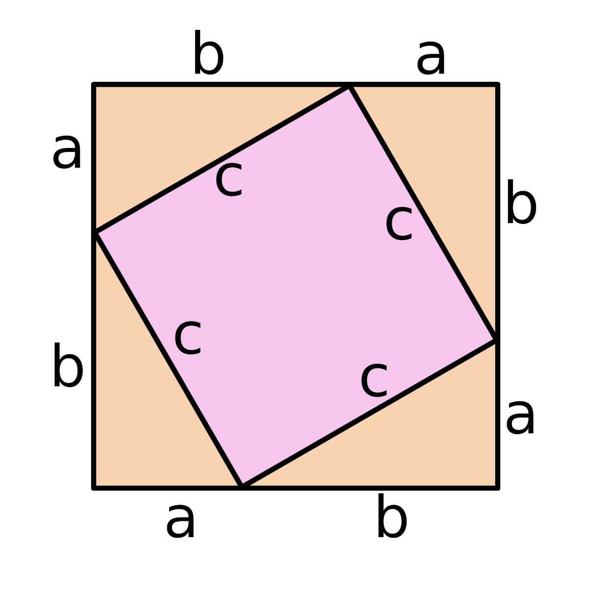 In Bhaskara's proof, the area of the inner square is c2, the area of the outer square is (a+b)2, and the area of each triangle is (1/2)(ab).
