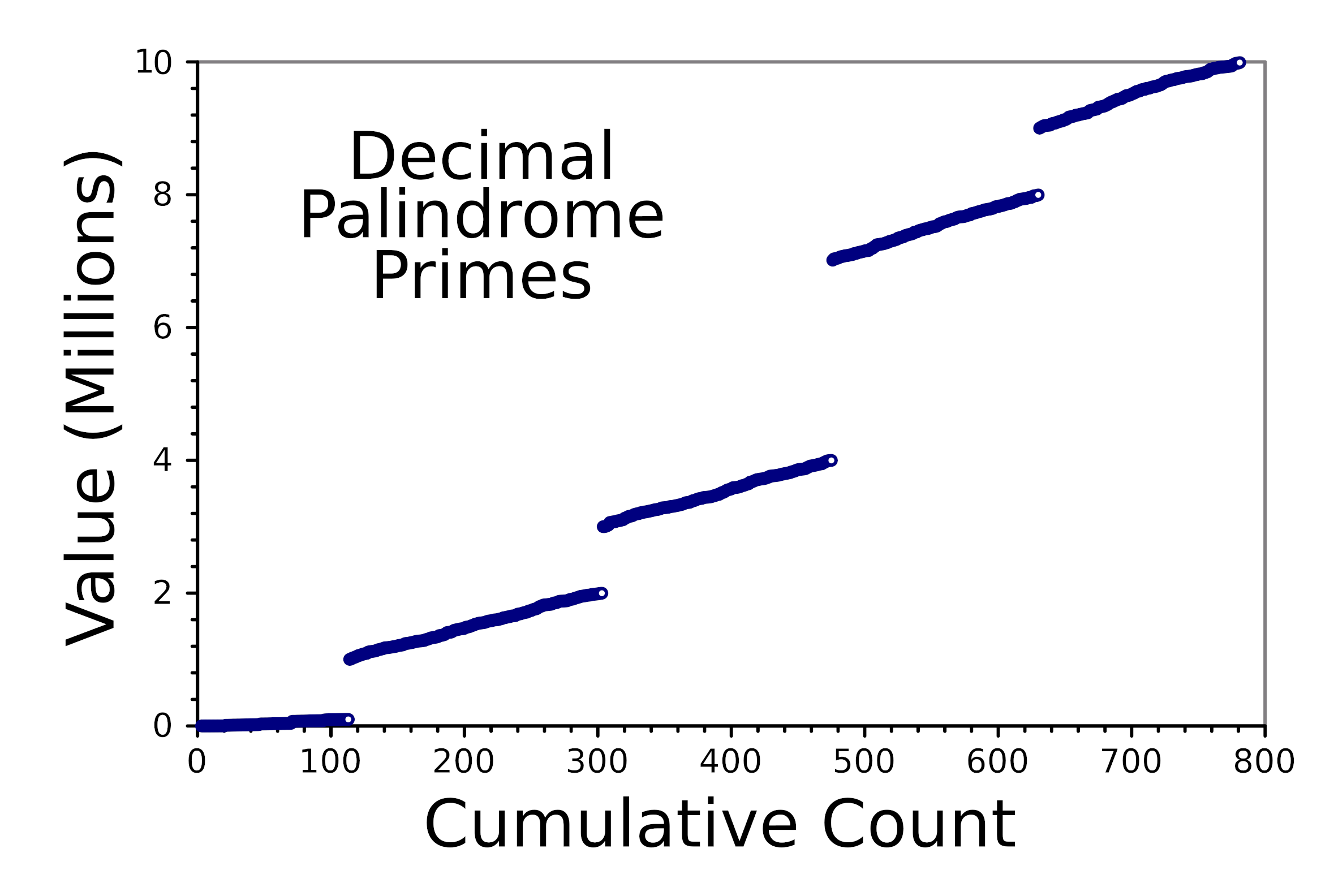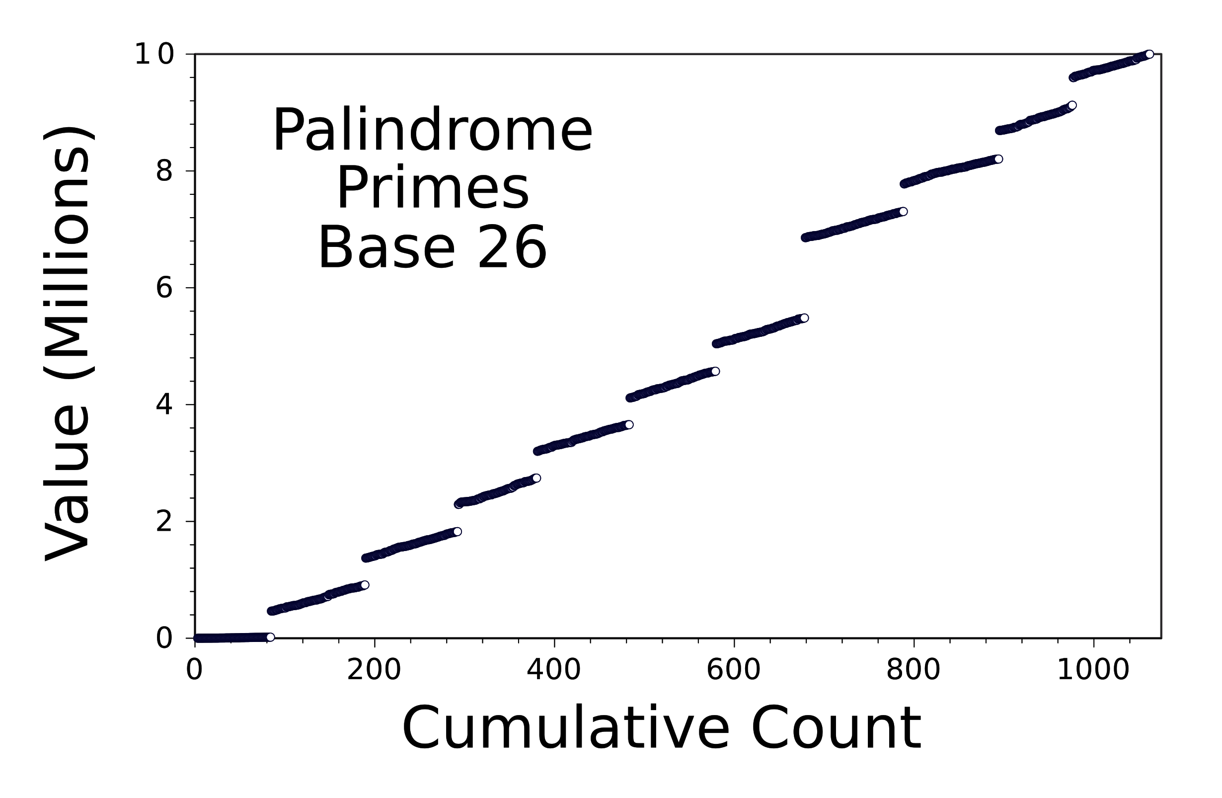 Graph of hexavigesimal (Base 26) palindrome primes less than ten million.